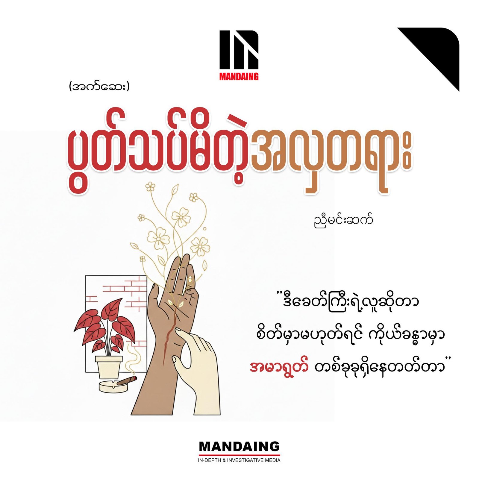 ညီမလေးရဲ့ အဲဒီစကားကိုကြားတော့ ကျိုးပြီးငေါ်ထွက်နေတဲ့ ပုခုံးညှပ်ရိုးကို ကျနော်မရည်ရွယ်ဘဲကိုင်ကြည့်မိသွား တယ်။ အညှိုးမဟုတ်ပေမဲ့ ဘယ်လိုမှ မေ့လို့မရတဲ့ လူမဆန်တဲ့ ရက်စက်မှုတွေအကြောင်းက ညီမလေးပြောသလို ဖြတ်သန်းမှုပုံပြင်တွေလားလို့ ညှပ်ရိုးအငေါကို တို့ထိရင်း ကျွန်တော် တွေးမိသွားတယ်။ ပြီးတော့ ဘယ်လိုဖြစ်ပြီး ကျိုးသွားတာလဲလို့ လူတွေမေးလာတုန်းမှာ ကျွန်တော် ဘယ်လိုပြန်ဖြေဖြစ်ခဲ့မိလဲလို့ ပြန်အစဖော် စဉ်းစားမိ သွားတယ်။
