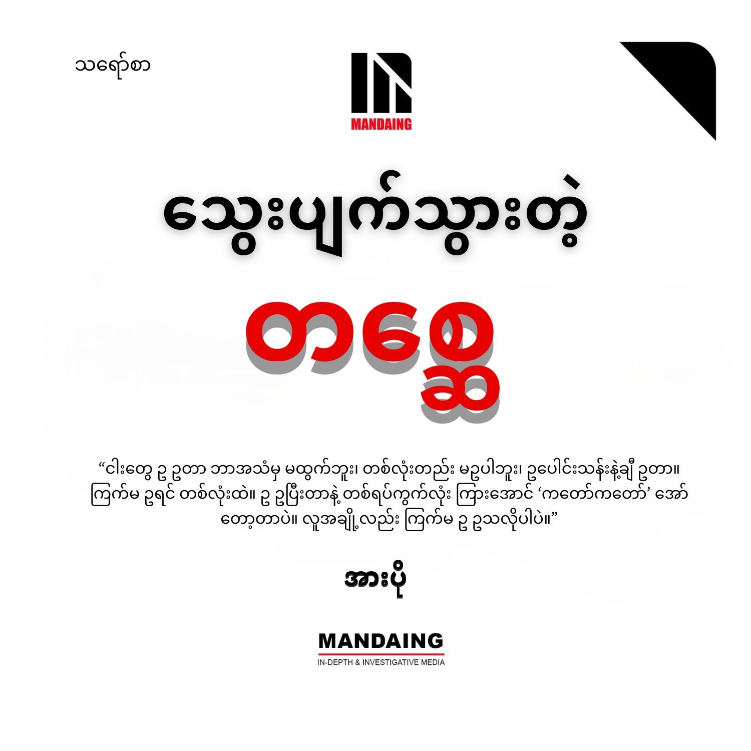 သတင်းစာပညာ မတောက်တခေါက်သိထားတဲ့ တစ္ဆေအဖို့ အဲသည်လိုလူတွေဟာ ကြောက်စရာပဲလို့ သိလာပါတယ်။ တချို့ကတော့ စကားမပြောကြဘဲ တယ်လီဖုန်းပွတ်နေကြတယ်။ သူတို့ ဘာတွေကြည့်နေကြသလဲ သိချင်တာနဲ့ တစ္ဆေလည်း သူတို့ဖုန်းတွေကို လိုက်ကြည့်မိပါတယ်။ တစ်တော့တွေ၊ ဖေ့စ်ဘုတ်တွေမှာ နယ်ဘက် မြို့နယ်တစ်ခုက ဘုန်းကြီးကျောင်းထဲမှာ မဖွယ်မရာပြုမူကြတဲ့ စုံတွဲကိစ္စ၊ လိုင်းပေါ်တင်လာတဲ့ ဗီဒီယိုအကြောင်း။ အခုထိကိုအပြစ်တင်လို့ ကောင်းနေကြတုန်းပါလား။ တစ္ဆေလည်း အဲဒါမျိုးတော့ ရှုတ်ချပါတယ်။ သူတို့လုပ်ရပ်ကို ရွံရှာပါတယ်။ ထိုက်သင့်တဲ့ပြစ်မှုပြစ်ဒဏ်ကျခံသင့်တာထောက်ခံပါတယ်။ နို့ပေမဲ့ အဲသည့်စုံတွဲကို အဲသည့်ကိစ္စအတွက် ဝိုင်းပြီးစီရင်ချက်ချနေကြသူတွေ၊ မပြီးနိုင်မစီးနိုင် ရွံရှာအော့အန်နေကြသူတွေ၊ လိုင်းပေါ်မှာ ထပ်ခါထပ်ခါ ရှယ်ပြီး အတန်ရှင်ရှာနေကြတာတွေကိုတော့ တစ္ဆေ မြင်ရတာ သိပ်အဆင်ပြေမနေဘူး။
